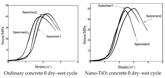 Figure 7 illustrates the compressive stress–strain curves of ordinary concrete and NTC specimens after freeze–thaw cycles. It can be observed that freeze–thaw cycling has a relatively minor impact on the overall stress–strain behavior of the NTC-modified concrete. The stress–strain curve of NTC exhibits the typical three-stage behavior found in ordinary concrete: (1) compaction stage, (2) elastic stage, and (3) yield stage. However, compared with ordinary concrete, NTC specimens show reduced dispersion in stress–strain responses under the same number of freeze–thaw cycles. This indicates that the incorporation of nano-TiO2 improves the compressive stability of concrete subjected to repeated freeze–thaw action. With increasing freeze–thaw cycles, the peak strain of ordinary concrete gradually decreased, indicating a loss in ductility. In contrast, the NTC specimens exhibited a slight increase in peak strain compared to the initial value. The freeze–thaw durability of cementitious materials largely depends on their transport properties, such as permeability and diffusivity, which are governed by the total pore volume, pore size distribution, shape, and connectivity. The addition of nano-TiO2 effectively reduces the porosity and permeability of the concrete matrix, thereby limiting water ingress and associated freeze-induced stress damage. As a result, the material experiences less structural degradation and demonstrates a modest improvement in ductility, confirming that nano-TiO2 enhances the freeze–thaw resistance of concrete.