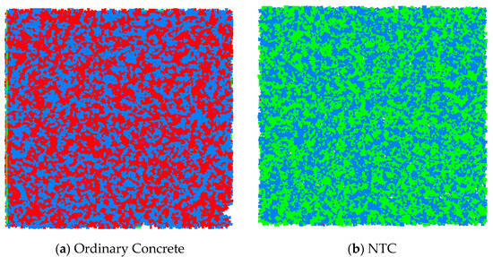 For ordinary concrete, the undamaged parallel-bond parameters were set as follows: effective modulus: 28.05 GPa; tensile strength: 25 MPa; bond strength: 100 MPa. After 100 freeze–thaw cycles, 50% of the particle bonds were assigned degraded parameters: effective modulus: 10 GPa; tensile strength: 5 MPa; bond strength: 50 MPa. For the NTC specimens, the initial (intact) bond parameters were as follows: effective modulus: 28.05 GPa; tensile strength: 31 MPa; bond strength: 100 MPa. After 100 cycles, the degraded 50% of the bonds were set as follows: effective modulus: 10 GPa; tensile strength: 20 MPa; bond strength: 90 MPa. These values reflect the enhanced freeze–thaw resistance and reduced microstructural degradation of the NTC. By establishing a mapping between macro-scale mechanical performance and mesoscopic simulation parameters, the model can effectively capture the degradation mechanisms and durability differences between ordinary and nano-modified concretes under freeze–thaw action.