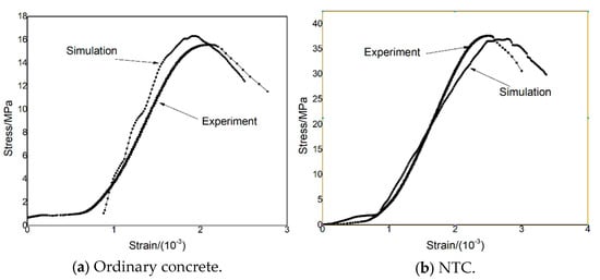 These results demonstrate that the numerical model can effectively reproduce the mechanical behavior of the tested materials, particularly with respect to capturing the peak compressive strength and the associated strain levels. The close agreement between the simulated and experimental peak values confirms the validity and applicability of the model in evaluating the mechanical degradation of concrete subjected to freeze–thaw cycles, and highlights the superior freeze–thaw resistance of NTC.