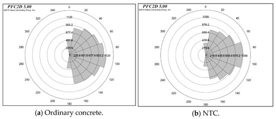 Figure 10 illustrates the statistical distribution of microcrack orientation and quantity in simulated specimens of ordinary concrete and NTC after undergoing freeze–thaw cycles. The results reveal that the ordinary concrete specimen developed a total of 8587 cracks, while the NTC specimen exhibited 7788 cracks, indicating a higher crack density and internal damage in the ordinary concrete.