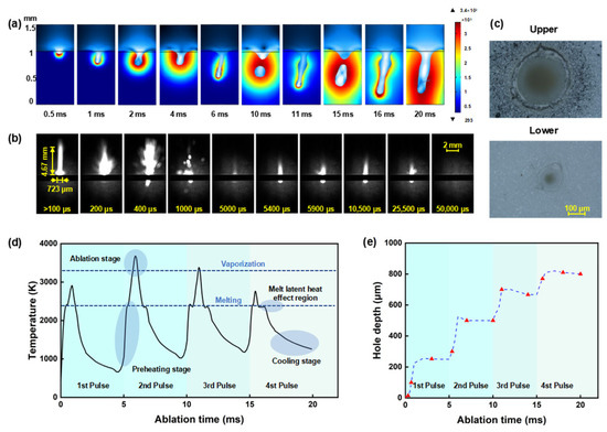 Numerical simulation, shadow imaging, and ablation zone morphology of millisecond laser oblique hole processing in alumina ceramic: (a) Temperature contour maps of the hole formation process; (b) Shadow sequence images of alumina ceramic processed by millisecond lasers at a repetition rate of 200 Hz; (c) Upper- and lower-surface morphology at a repetition rate of 200 Hz; (d) Temperature changes during the hole formation process. (e) Simulated depth changes at different ablation times.