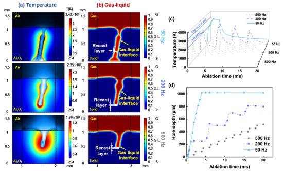 Numerical simulation results of oblique hole processing in alumina ceramic using millisecond lasers at different repetition rate: (a) Temperature contour maps of millisecond laser hole formation; (b) Gas–liquid volume fraction maps of millisecond laser hole formation; (c) Temperature changes during hole formation at different repetition rate; (d) Depth changes during hole formation at different repetition rate.