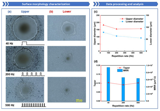 Figure 4a,b display the morphology of the upper and lower surfaces at different repetition rates. Under the condition of the same total energy, a higher repetition rate means lower single-pulse energy and higher pulse rate, leading to a more uniform distribution of laser energy over time; a lower repetition rate means higher single-pulse energy and lower pulse rate, resulting in a more concentrated distribution of laser energy over time. Higher single-pulse energy provides better material removal efficiency, so as the repetition rate increases, the diameters of both the upper and lower surfaces tend to decrease; the diameter of the upper surface decreased from 182 μm to 157 μm, and the diameter of the lower surface decreased from 79 μm to 55 μm, as shown in Figure 4c.