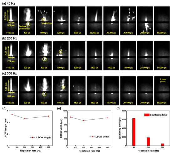 Shadow sequence images of alumina ceramic processed by millisecond lasers at different repetition rates: (a) 40 Hz; (b) 200 Hz; (c) 500 Hz; (d) LSCW length line chart; (e) LSCW width line chart; (f) Sputtering time bar chart.