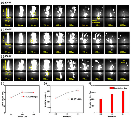 Shadow sequence images of alumina ceramic processed by millisecond lasers at different power levels: (a) 200 W; (b) 400 W; (c) 600 W; (d) LSCW length line chart; (e) LSCW width line chart; (f) Sputtering time bar chart.