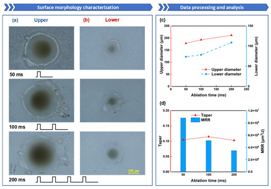 The influence of ablation time on oblique hole processing performance: the ablation time is set to 50 ms, 100 ms, and 200 ms, while the other parameters are fixed: power of 600 W, duty cycle of 20%, and repetition rate of 100 Hz: (a) Upper-surface morphology; (b) Lower-surface morphology; (c) Upper- and lower-surface diameter line chart; (d) Taper and ablation efficiency comparison.