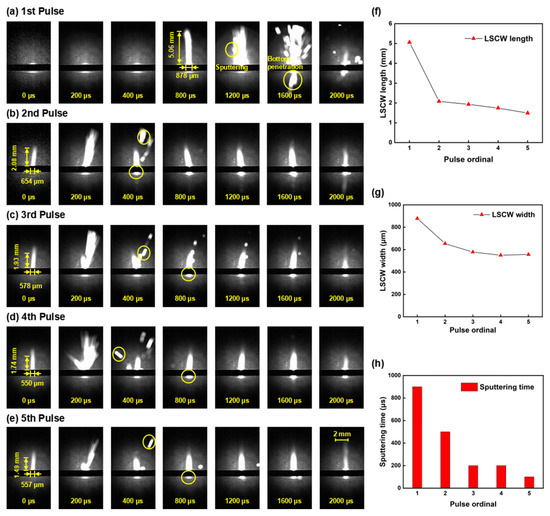 Figure 9f–h present line charts derived from the ablation process data illustrated in Figure 9a–e, showing that as the number of pulses increases, the height and width of the LSCW, as well as the duration of sputtering, gradually decrease. The decrease from the first to the second pulse is particularly pronounced, with subsequent data showing a gradual but less significant decline.