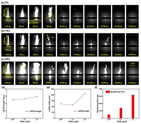 Shadow sequence images of alumina ceramic processed by millisecond lasers at different duty cycles: (a) 5%; (b) 10%; (c) 20%; (d) LSCW length line chart; (e) LSCW width line chart; (f) Sputtering time bar chart.