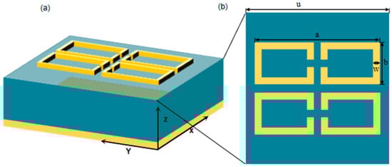 Typical THz metamaterial sensors usually consist of a metal resonator-dielectric-metal “sandwich” structure [28,29,30], where the commonly used metal materials are gold or silver. The metal resonator layer can be designed into different shapes, such as double openings, “H”-shapes, “E”-shapes, etc., in order to achieve flexible modulation of electromagnetic waves. In this study, the three-band THz metamaterial sensor structure based on a metal split ring [31] is used as a reference. This structure consists of a metal resonant layer, a dielectric layer, and a metal reflective layer, respectively, and its top layer consists of a periodic square metal split ring, as shown in Figure 1. The metal resonator and reflection layers are made of gold, as it has an excellent electrical conductivity of 3.56 × 107 S/m. The material of the intermediate dielectric layer is polytetrafluoroethylene with a dielectric constant of 2.1 (1 + i0.0002). Based on the microwave simulation using the CST software, periodic boundaries are set in the x and y directions, and open boundary conditions are set in the z direction, and THz waves are incident vertically into the absorber along the x-axis direction. The absorption curve of this absorber is calculated using the finite element method.