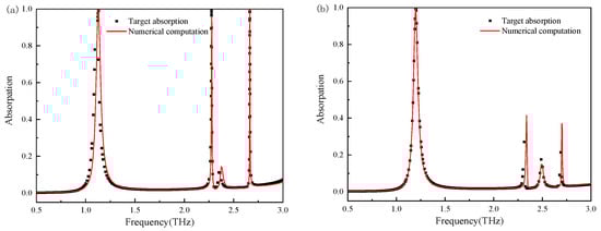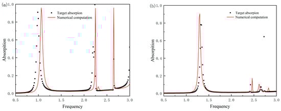 Case comparison chart. (a) Comparison of target absorption spectrum and numerical computation result for Test Case 1 (out-of-range parameters: u = 116 μm, a = 85 μm); (b) Comparison of target absorption spectrum and numerical computation result for Test Case 2 (out-of-range parameters: u = 123 μm, a = 74 μm).