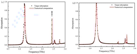Figure 3 compares the target absorption spectra with the absorption spectra obtained using the CST full-wave numerical computation applied to the model-generated sensor structure parameters. The black dotted curve indicates the target absorption spectra, and the red curve indicates the absorption curves obtained using the CST software. It can be observed that the target absorption curve and that from the predicted structure obtained using the model almost overlap in most cases (a, b, d), demonstrating the model’s high fidelity. However, a slight discrepancy is observed in the third peak intensity and linewidth of panel (c). This deviation likely stems from the inherent difficulty in capturing the complex nonlinear coupling between structural parameters and resonant behavior at specific frequencies. The corresponding design point may lie within a highly sensitive region of the parameter space, where small geometric variations lead to significant changes in the electromagnetic response. Although the training dataset consists of 10,000 samples, certain subregions—especially those defined by parameters u, a, b, and h—may be insufficiently represented, thereby limiting the model’s ability to generalize across the entire design space. This limitation is commonly encountered in data-driven inverse design frameworks, where model performance is strongly influenced by the diversity and density of the training data. As Wei et al. [34] have noted, the accuracy of phase prediction and device performance in Bi-DNN-based metasurface design is highly dependent on dataset coverage. In this work, the observed error can be primarily attributed to such limitations, which constrain the model’s capacity to learn the full nonlinear mapping between electromagnetic responses and structural geometries. During the validation of the experimental results, it is found that the proposed model takes an hour to generate the structural parameters of a 200 THz metamaterial sensor; however, the CST software takes 36 h to carry out the same task over 200 iterations. Therefore, the model proposed in this chapter reduces the computational complexity and can accurately generate the required structural parameters.