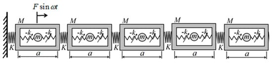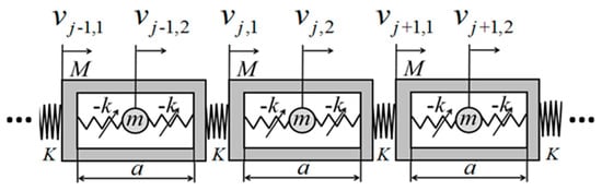 Inspired by the metamaterial models proposed in Refs. [18,38], a metamaterial model incorporating negative-stiffness characteristics is established. An infinitely periodic metamaterial configuration, as depicted in Figure 1, is considered, with a shell length of a , with an outer shell mass of M , a spring stiffness factor of K connecting the two outer shells, an inner oscillator mass of m , an inner oscillator that is a negative-stiffness Duffing oscillator, a spring linear stiffness factor of K connecting the negative-stiffness Duffing oscillator to the outer shell, and a coefficient of Γ in front of the cubic term of the displacement. And for the j st period, u j , 1 and u j , 2 denote the displacements of the shell and the negative-stiffness Duffing oscillator for the j th period, respectively. u j 1 , 1 and u j 1 , 2 denote the displacements of the shell and the negative-stiffness Duffing oscillator for the j 1 th period, respectively. And u j + 1 , 1 and u j + 1 , 2 denote the displacements of the shell and the negative-stiffness Duffing vibrator for the j + 1 th period, respectively. The system is modeled dynamically in the following figure.
