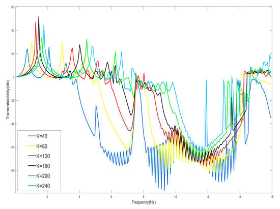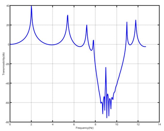 It has been known from the previous discussion of the bandgap starting frequency that, similarly to periodic structures containing positively stiffened Duffing oscillators, the presence of weakly nonlinear factors only varies marginally around the value of the frequency of their degenerate linear system, but the negatively stiffened Duffing oscillators and shells with linear stiffness ratios of α and mass ratios of β both produce variations in the starting frequency. Furthermore, the starting frequency is lower than that of the linear oscillator’s resonant frequency of the linear oscillator. That is, the bandgap is also not always due to the effective negative mass. In the bandgap range, the negatively stiffened Duffing oscillator and the shell should have effective positive mass below the linear resonance frequency for each period, and effective negative mass below the cutoff frequency above the resonance frequency. For effective comparison, m = 0.125   kg , M = 0.1 kg, k = 123.2 N/m, n = 1, K = 240 N/m are still taken here, and the vibration-transfer characteristics of their corresponding systems are shown in Figure 9. Moreover, the frequency at 10 Hz in the bandgap range corresponds to the frequency value of the start of the effective negative mass, and 15 Hz is the frequency value of the zero mass, so 10 Hz to 15 Hz corresponds to the effective negative mass region. And the frequencies below 10 Hz in the bandgap range should correspond to the effective positive mass region.