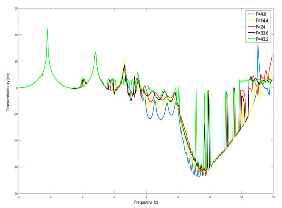 The external excitation amplitude F changes the bandgap starting frequency and cutoff frequency, and as F increases, the starting frequency becomes higher and the cutoff frequency becomes lower. The bandgap width becomes small, and the corresponding bandgap frequency. When the external excitation amplitude is small, when the external excitation amplitude becomes large to a certain value, the vibration transmission characteristics of the system at the corresponding frequency have a tendency to decrease to increase, and are no longer located in the bandgap range.