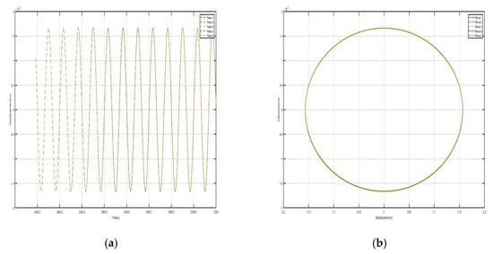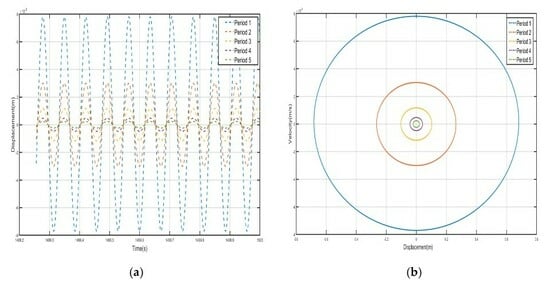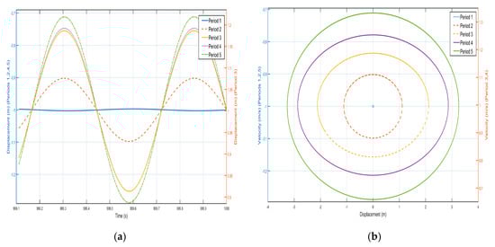 Figure 22. Five periodic shells’ (a) displacement–time history curves and (b) velocity-displacement phase diagrams. (zero mass).