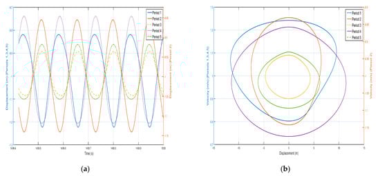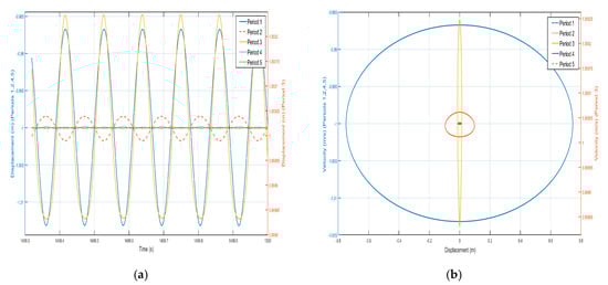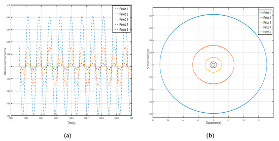 Figure 23. Five periodic negative-stiffness Duffing oscillators’ (a) displacement–time history curves and (b) velocity-displacement phase diagrams. (zero mass).