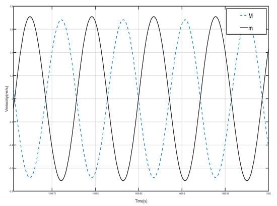 Draw the first period of the shell and Duffing vibration velocity–time history curves, as shown in Figure 12. Figure 12 has a dashed line for the velocity–time history curve of the shell, and a solid line for the negative-stiffness Duffing vibrator velocity–time history curve; from the figure, it can be seen that when the shell M motion speed reaches the negative amplitude, the negative-stiffness Duffing vibrator m has movement to the positive amplitude, and when the M motion speed has the positive amplitude, the m motion speed has the negative amplitude, so the M and m of the motion speed is always the opposite of shell and vibration at anti-phase. Since the selected m mass is larger than M , under the same external excitation amplitude, the object with smaller mass is more likely to change its velocity, so the corresponding displacement is larger. Further analysis can be obtained; when the momentum of the internal negative-stiffness Duffing vibrator is greater than the momentum of the shell, then a single-period shell and negative stiffness Duffing vibrator composed of the system has a negative momentum, because the speed is positive so the system has a negative mass, and the system plays the role of vibration-damping vibration absorption.