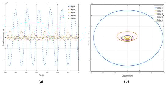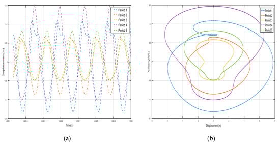 Figure 13. Five periodic shells’ (a) displacement–time history curves and (b) velocity-displacement phase diagrams. (F = 24 N, 14 Hz).