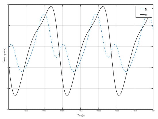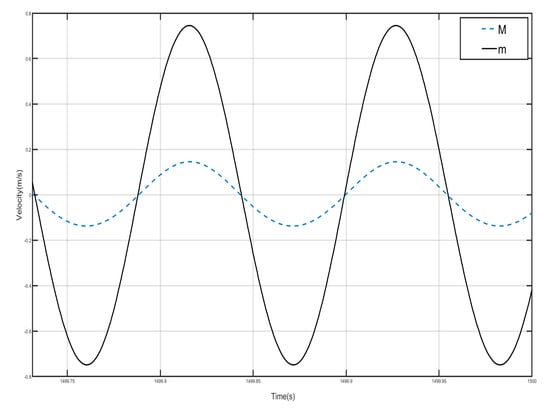 Draw the velocity–time history curves of the shell and the negative-stiffness Duffing vibrator during the first period of vibration, as shown in Figure 15. The dashed line in Figure 15 is the velocity–time history curve of the shell, and the solid line is the velocity–time history curve of the negative-stiffness Duffing vibrator. It can be seen from the figure that when the motion velocity of the shell M reaches the positive amplitude, the motion velocity of the negative-stiffness Duffing vibrator m does not reach the negative amplitude, and when the motion velocity of M is the negative amplitude, the motion velocity of m does not reach the positive amplitude, so the motion velocity of M and m are not always opposite; most of the time the motion of the shell and the internal negative-stiffness Duffing vibrator is not always opposite, and most of the time the motions of the shell and the internal negative-stiffness Duffing oscillator are in the same direction. Further analysis can be obtained that the momentum of the internal negative-stiffness Duffing oscillator and the shell add up to a positive value, and the cell is of effective positive mass.