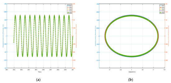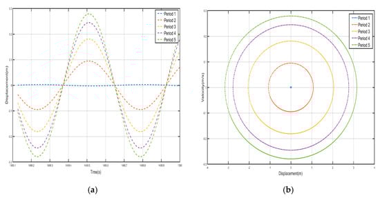 Figure 19. Five periodic shells’ (a) displacement–time history curves and (b) velocity-displacement phase diagrams. (F = 24 N, 1.8 Hz).