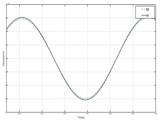 The velocity–time history curves of the shell and Duffing vibrator after steady state of the first period are drawn, as shown in Figure 21; the dotted line is the velocity–time history curve of the shell, and the solid line is the velocity–time history curve of the negative-stiffness Duffing vibrator. It can be seen that when the shell M motion speed reached the positive amplitude, negative-stiffness Duffing vibrator m motion speed also reached the positive amplitude, when the shell M motion speed reached the negative amplitude, m motion speed is also negative amplitude, so the M and m motion speed is always the same direction, and the velocity values of the shell and the negative-stiffness Duffing oscillator are very close, so the periodic unit conforms to the characteristics of effective positive mass.
