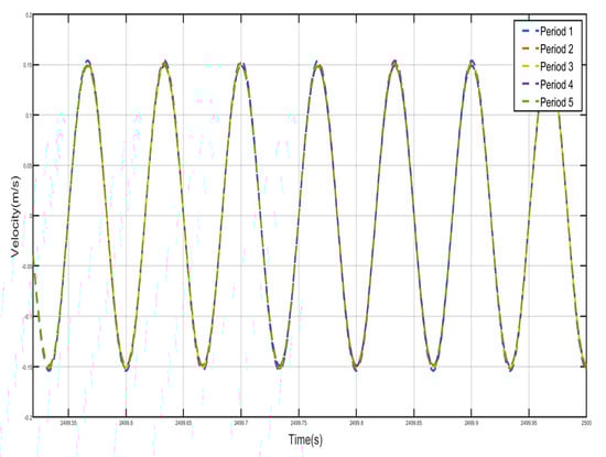 Figure 25. Five periodic negative-stiffness Duffing oscillators’ velocity–time history curves. (zero mass).