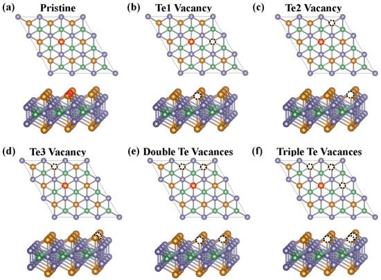 All calculations were performed within the framework of density functional theory (DFT) using the VASP software. Different Te vacancy concentrations of 5.56%, 11.1%, and 16.7%, and different Te vacancy positions are considered in the Fe3GeTe2 (001) surface, as shown in Figure 1a. The (001) basal plane was derived by exfoliating the bulk Fe3GeTe2. We introduced the single- (Figure 1b–d), double- (Figure 1e), and triple (Figure 1f)-Te vacancy defects by removing surface-layer Te atoms from the surface layer, and added a 15 Å vacuum layer to eliminate periodic interactions. These surface Te vacancies can be experimentally realized through solid-state reactions, high-temperature annealing, or chemical reduction methods [26,27,28]. A 3 × 3 supercell was used for modeling, atomic positions were fully relaxed until the energy change between steps was <10−5 eV, and the force on atoms was <0.01 eV/Å. The plane-wave basis set cutoff energy was set to 400 eV, and the electron–ion interaction was described using the projector augmented wave (PAW) method. The exchange correlation effects were treated using local density approximation (LDA) [29]. For geometry optimization and electronic structure calculations, the Monkhorst–Pack k-point grids were set to 5 × 5 × 1 and 11 × 11 × 1, respectively. In our previous work, we had thoroughly verified the calculation method and finally confirmed that the LDA method was the most reliable, where the LDA-calculated structural parameters (a = b = 3.89 Å, c = 15.87 Å, and mFe = 1.33 μB) agree well with the experimental values (a = b = 3.991 Å, c = 16.336 Å, and mFe = 1.2 μB).