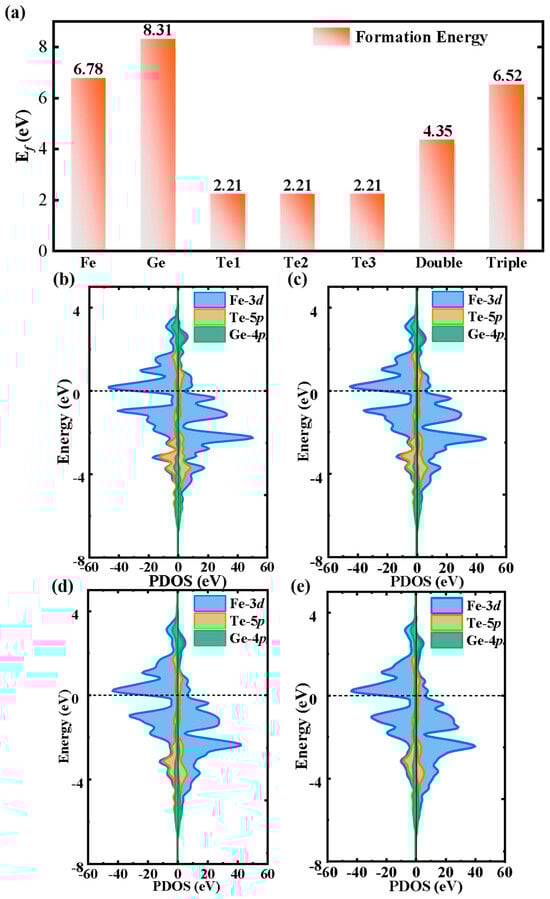 (a) The formation energies of different vacancy-defected Fe3GeTe2 (001) surfaces and spin-polarized projected density of states (PDOS) of (b) the pristine, (c) single-Te-vacancy-defected (Te1, Te2, and Te3), (d) double-Te-vacancy-defected, and (e) triple-Te-vacancy-defected Fe3GeTe2 (001) surface.