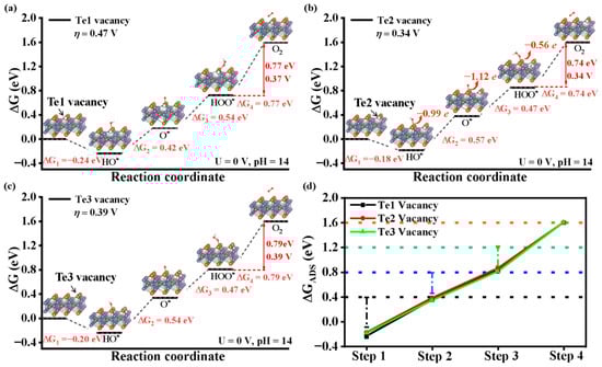 The Gibbs free energy of the OER process on the Fe3GeTe2 (001) surface with (a) Te1 vacancy, (b) Te2 vacancy, and (c) Te3 vacancy under the conditions of U = 0 V and pH = 14. (d) Comparison of the Gibbs free energies of oxygen-containing intermediates in each step with the ideal values.