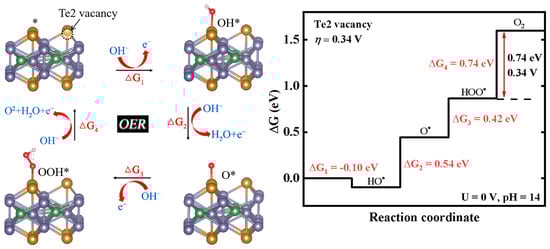 Furthermore, we reconstructed a 2 × 2 Fe3GeTe2 supercell containing a single Te vacancy (vacancy concentration: 12.5%), as shown in Figure 4. Surprisingly, there is a low overpotential of 0.34 V during the OER process. It is worth noting that despite the difference in concentrations, both systems involve only one Te vacancy, and their OER processes are similar, with identical overpotentials of 0.34 V. By contrast, at the same Te vacancy concentration (e.g., 5.56% as shown in Figure 3), the overpotentials are different.