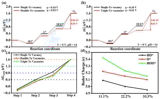 Figure 3a–c present the Gibbs free energy diagrams for the OER process on Fe3GeTe2 (001) surfaces with single-Te vacancies (Te1, Te2, and Te3, respectively). The Gibbs free energy values for each reaction step are as follows: Te1 vacancy surface: −0.24, 0.42, 0.54, and 0.77 eV; Te2 vacancy surface: −0.18, 0.57, 0.47, and 0.74 eV; and Te3 vacancy surface: −0.20, 0.54, 0.47, and 0.79 eV. The rate-determining step consistently occurs at the fourth step (HOO* → O2), with corresponding overpotentials η of 0.37 V, 0.34 V, and 0.39 V for Te1, Te2, and Te3 vacancy surfaces, respectively. Although the vacancy concentrations and formation energies of Te1, Te2, and Te3 in Fe3GeTe2 are identical at 2.21 eV, differences in their crystal structure persist. There are slight variations in bond lengths and bond angles. It is these structural disparities that result in differences in the binding strength between active sites and oxygen-containing intermediates. Consequently, the Gibbs free energy at each electronic step of the oxygen evolution has variations in the OER overpotential. Compared to the pristine Fe3GeTe2 (001) surface (η = 0.85 V), Te vacancies significantly enhance the OER catalytic activity and substantially reduce the overpotential. Moreover, this lower potential can rival the ideal OER performance of IrO2 (0.56 V) [35].