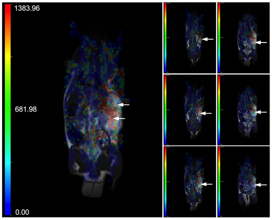 Representative parametric maps of blood volume, overlaid on T2-weighted images, are shown across different slices of a Wistar rat bearing a C6 glioma. The animal underwent dynamic susceptibility contrast MR imaging (DSC-MRI) following intravenous injection of Fe@C-(CH2)2CONH-anti-CD61 nanoparticles (200 μg mL−1) administered as a single bolus (0.5 mL) into the tail vein. DSC-MRI was conducted over 12.5 min using T2*-weighted EPI sequences (TR/TE = 1250/58 ms). Anatomical T2 images were performed using TSE sequences (TR/TE = 3000/80 ms). The left large image displays a parametric map from a single slice, while the right small images combine maps from multiple slices of the same rat. The accumulation of nanoparticles targeting the beta 3 subunit (CD61) on the integrin αvβ3 receptors in glioma tissue leads to localized magnetic susceptibility changes, visualized as areas of increased red intensity on the arbitrary unit (a.u.) color scale (refer to the scale for interpretation). Both the left and right images use the same color scale ranged from 0 to 1383.96 a.u. The C6 glioma is indicated by arrows.
