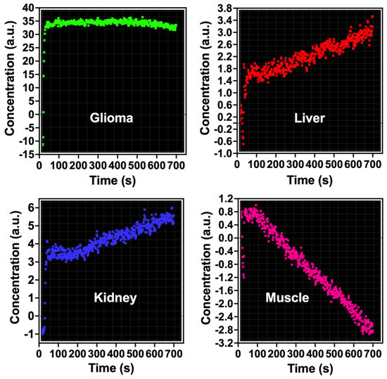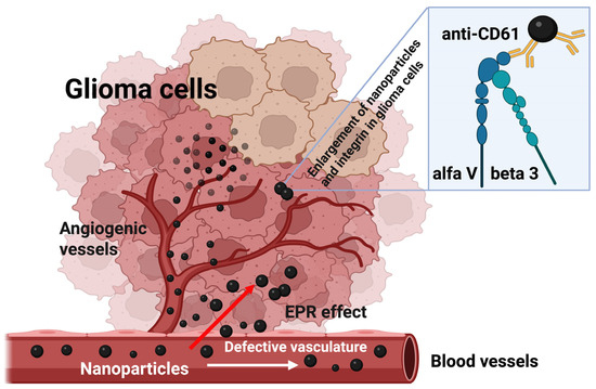 In the studies, we observed a pronounced increase in the concentration of Fe@C-(CH2)2CONH-anti-CD61 nanoparticles in glioma tissues and this could be associated with enhanced permeability and retention (EPR) effects (Figure 2). Such a significant increase (arbitrary units) was not found in the case of the liver or kidney (Figure 2). Please note that vascular extravasation in tumors refers to the leakage of blood components, including nanoparticles, from the tumor vasculature into the surrounding tumor tissue due to the abnormal structure and permeability of tumor blood vessels [62]. This phenomenon is often enhanced in tumors, allowing for greater penetration of nanoparticles, which can accumulate at higher concentrations in the tumor microenvironment, making them potential vehicles for targeted drug delivery [63]. The EPR effect, a hallmark of tumors, further facilitates the preferential accumulation of nanoparticles in tumor tissues, improving diagnostic and therapeutic outcomes [64,65]. This process is influenced by factors like nanoparticle size, tumor characteristics and the presence of leaky vasculature. The presence of beta 3 integrin receptors in glioma tissues and glioma vasculature may significantly enhance the deposition of these nanoparticles in glioma as compared to other analyzed organs (Figure 2). Our previous relaxometric measurements indicate the temporary deposition of Fe@C-(CH2)2CONH-anti-CD61 in glioma and melanoma tumors examined in murine syngeneic mice models [20,54]. The current results therefore confirm the observed effects, indicating the deposition of nanoparticles functionalized with antibodies recognizing CD61 integrin receptors. Of course, in the case of nanoparticles, we cannot rule out the nanoparticle extravasation effects.