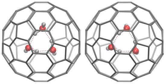 Compared to other non-metallic endohedral fullerenes like [2,13] N2@C60 or CO@C60, the water dimer would be rather large to fit in the C60 cage (though H2O@C60 can be prepared [18]). Figure 2 presents [36] the geometrical structure of (H2O)2@C60 optimized with the M06-2X/6–31G** method. The encapsulation energy of the water monomer calculated with the MP2/6–31G approach (without the BSSE term) is [27] −9.9 kcal/mol. However, the inclusion of the water dimer into C60 is repulsive at the same level, i.e., it exhibits [27] a positive (and not negative) encapsulation energy of 24.5 kcal/mol. The calculations instead indicated [36] C84 cages as convenient fullerenes for the water-dimer encapsulation, particular its two most stable species [109,110,111], conventionally labelled as (22)-C84 and (23)-C84 (coded by their symmetries and serial enumeration numbers).
