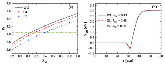 (a) Work function as a function of the coefficient using WG (black solid line), GL (red dashed line), and PZ (blue dotted line) XC potentials. The horizontal dashed line represents the DFT reference value. The intersection points with the DFT reference are at , , and , respectively. (b) Effective potentials corresponding to these intersections, normalized by .