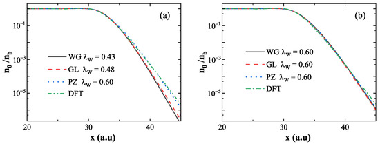 Normalized ground-state density obtained using different energy functionals. (a) for WG (black solid line), for GL (red dashed line), and for PZ yield consistent work functions with DFT; DFT result shown in green line. (b) WG, GL, and PZ functionals with fixed . While significantly affects the decay of surface density, the XC potential has negligible influence.
