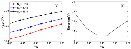 (a) LSP energy as a function of the coefficient for nanospheres with 1074 (red squares line), 2048 (blue circles line), and 6174 (black triangles line) electrons. All exhibit linear increases in LSP energy with increasing . (b) Average error in LSP energy (relative to TDDFT results) for the three nanospheres. The minimum error occurs near .