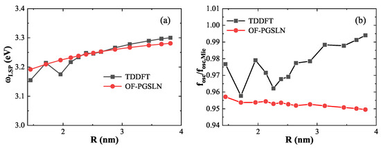 In the previous section, the excited-state energy functional was calibrated using three representative nanospheres. To further assess the accuracy and generalizability of our approach across a broader size range, Figure 7 presents the LSP energies and corresponding oscillator strengths for nanospheres of various sizes, as computed using the OF-PGSLN method (red dashed lines) and compared with TDDFT results (black solid lines) from Ref. [24].
