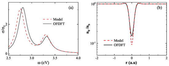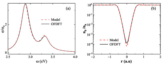 Validation of the linear superposition approximation at large distances (). (a) Absorption spectra computed from model density (red dashed line) and OFDFT density (black solid line) show excellent agreement. (b) Ground-state electron density at the dimer center, revealing only a minor difference between the two methods.