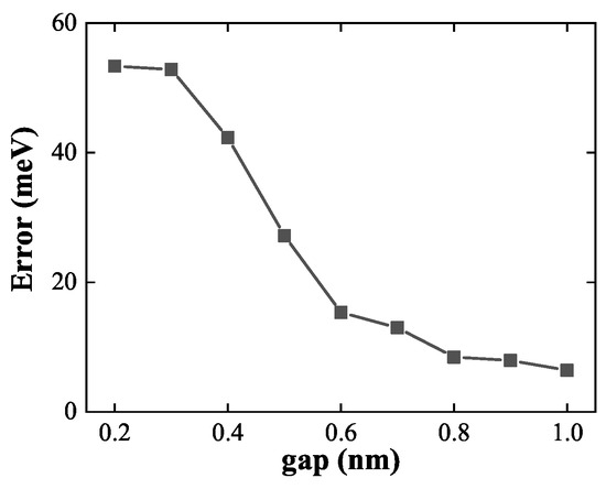 To quantitatively evaluate the performance of the linear approximation across different interparticle separations, Figure 10 plots the LSP energy error as a function of dimer gap. While the error remains below for gaps larger than , it increases sharply below , saturating at approximately in the strongly coupled regime. These results highlight the dual nature of the linear superposition approach: it fails under strong coupling but becomes a powerful and efficient modeling tool when the constituent nanostructures are sufficiently separated. This strategy is especially advantageous for simulating large nanoparticle assemblies, where reusing precomputed ground-state density can drastically reduce computational overhead.