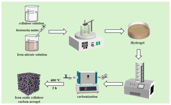 Figure 1 illustrates the synthesis procedure for metal oxide/carbon aerogel. Initially, 2 g of nonahydrate ferric nitrate was dissolved in 100 mL of deionized water under magnetic stirring, followed by the addition of 3 mL of ammonia water (20%) with continued magnetic stirring (800 r/min) for 1 h to ensure complete dispersion of the formed ferric hydroxide. Further, 2 g of nanocellulose was dispersed in 100 mL deionized water through an ultrasonic treatment (SONICS-1800W, Taixing Xingjian Chemical Machinery Co., Ltd., Taixing, China) for 10 min to obtain a 2 wt% nanocellulose solution. The nanocellulose solution was then added to the ferric hydroxide solution along with 2 mL polyethyleneimine, and the mixture was subjected to further magnetic stirring for 2 h.