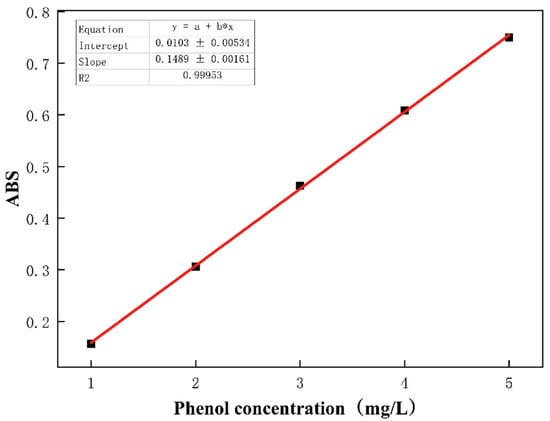 Phenol was selected as a typical phenolic substance to evaluate the adsorption performance of carbon aerogel. A predetermined quantity of carbon aerogel was introduced into a 50 mL conical flask containing 40 mL of phenol solution (100 mg/L). Prior to adsorbent addition, the initial pH of the solution was adjusted to the desired value using 0.1 M HCL and 0.1 M NaOH solutions. The mixture was then agitated in a constant temperature shaker at 250 rpm reaching the predetermined contact time was reached. Subsequently, the sample was centrifuged at 4000 r/min for 10 min to separate the catalyst from the solution. The supernatant was carefully taken after centrifugation, and the phenol concentration was determined by the 4-aminoantipyrine method. The absorbance was measured at 510 nm with a UV spectrophotometer (WF Z UV-2800H, Unico, Suite E, Dayton, NJ, USA), and the phenol concentration was calculated by referencing a pre-established standard calibration curve (Figure 2). The adsorption capacity was calculated according to Formula (1):