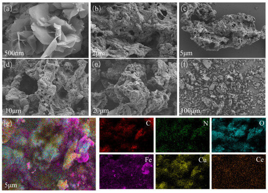 In this section, we present the surface morphology of the prepared composite metal oxide-based carbon aerogel. As shown in Figure 3, the material prepared by crosslinking cellulose with polyethyleneimine had a porous structure and a rough surface, which is conducive to the adsorption and degradation of phenol. Moreover, SEM images (a) and (b) show Fe3O4/CA, (c) and (d) are of Fe3O4/CuXO/CA, and (e) and (f) illustrate Fe3O4/CuXO/CeXOY/CA. Meanwhile, EDS confirms the uniform distribution of C, N, and O elements, along with the uniform loading of Fe, Cu, and Ce elements onto the carbon aerogel.
