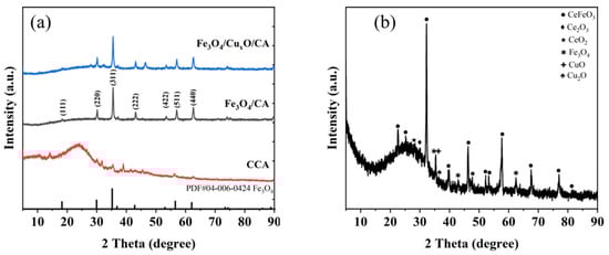 The synthesis of iron oxide/copper oxide carbon aerogel followed an analogous procedure, wherein 2 g of nonahydrate ferric nitrate and 0.3 g of trihydrate copper nitrate were dissolved in 100 mL deionized water, followed by the addition of 4.5 mL ammonia water under magnetic stirring (800 r/min) for 1 h. For the iron oxide/copper oxide/cerium oxide carbon aerogel, 2 g nonahydrate ferric nitrate, 0.3 g trihydrate copper nitrate, and 0.2 g cerium nitrate hexahydrate were dissolved in 100 mL water, prior to the addition of 4.5 mL ammonia water and subsequent magnetic stirring (800 r/min) for 1 h. The resulting materials were designated as Fe3O4/CA, Fe3O4/CuXO/CA, and Fe3O4/CuXO/CeXOY/CA for the iron oxide/cellulose-based carbon aerogel, the iron oxide/copper oxide carbon aerogel, and the iron oxide/copper oxide/cerium oxide carbon aerogel, respectively.