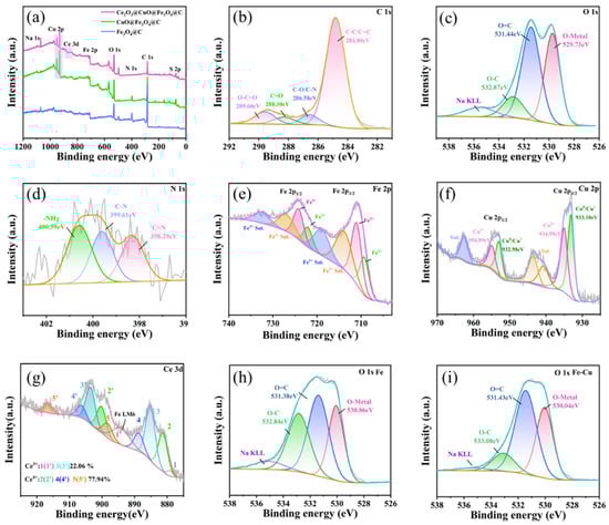 (a) The full spectrum; (b) the high-resolution spectrum of the C 1s orbital; (c) the high-resolution spectrum of the O 1s orbital; (d) the high-resolution spectrum of the N 1s orbital; (e) the high-resolution spectrum of the Fe 2p orbital; (f) the high-resolution spectrum of the Cu 2p orbital, and (g) the high-resolution spectrum of the Ce 3d orbital. (h) High-resolution spectroscopy of the O 1s orbit in iron materials; (i) High-resolution spectra of the O 1s orbitals in iron and copper materials.