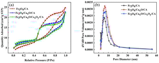 The N2 adsorption–desorption isotherm of the material exhibits a typical type IV isotherm, confirming the mesoporous nature of all samples [28]. As shown in Figure 6a, the synthesized materials demonstrate relatively high specific surface areas of 26.67, 26.08, and 26.53 m2/g, respectively. The pore size distribution curve indicates that the majority of pores fall within the 0–20 nm range [29]. These structural features, including the substantial surface area and mesoporous material, facilitate increased active site availability and enhanced pollutant adsorption capacity, ultimately contributing to improved catalytic performance [30].