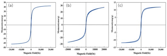 As shown in Figure 7, the vibration sample magnetometer (VSM) test results of the sample are presented. From the hysteresis curve in Figure 7a, it can be seen that the saturation magnetization (Ms) of the Fe3O4/CA sample is 42.26 emu/g, satisfying the requirement for efficient magnetic recovery under an external field [31]. The residual magnetism (Mr) of 8.91 emu/g remains relatively low, facilitating the prompt release of pollutants after magnetic separation and minimizing secondary treatment [32]. The coercive force (Hc) is 185.57 Oe, which belongs to semi-hard magnetic materials and can reduce the risk of demagnetization [33]. Figure 7b displays the hysteresis curve of the Fe3O4/CuxO/CA sample, with Ms of 27.20 emu/g, meeting the basic requirements for recovery in this trip. The Hc of 108.88 oe indicates weak ferromagnetic behavior, effectively preventing activity loss due to particle agglomeration [34]. Furthermore, the low Mr of 2.43 emu/g significantly minimizes post-reaction particle retention, thereby reducing the potential for separation equipment clogging [35]. Figure 7c shows the hysteresis curve of the Fe3O4/CuxO/CexOy/CA sample, with Ms being only 11.90 emu/g. It may lead to difficulties in magnetic recovery. The reason for this might be that the tetravalent cerium shifts the Fe3+/Fe2+ ratio towards the non-magnetic Fe3+, weakening the formation of the Fe3O4 phase [36]. At the same time, the triple non-ferromagnetic components further dilute the magnetism, resulting in the weakest magnetism and a higher Hc of 246.55 Oe [37]. After magnetization, it is not easy to demagnetize, and this is conducive to recovery. The Mr was 3.31 emu/g, suggesting minimal residual magnetism after demagnetization [38].