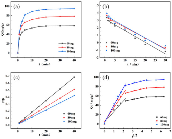 Among them, Qe (mgg−1) and Qt (mgg−1) respectively represent the adsorption capacity at equilibrium and time t. k1 (min−1), k2 (mgg−1min−1), and kp (mgg−1min−1/2) represent quasi-first-order, quasi-second-order, and in-particle diffusion rate coefficients, respectively.