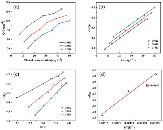 (a) The equilibrium adsorption isotherms of phenol by Fe3O4/CA composites at different temperatures, (b) the Langmuir model, (c) the Freundlich model, and (d) the relationship graph of lnK0 and 1/T in the Gibbs free energy calculation, from which △Hθ and △Sθ can be calculated, and thus △Gθ can be calculated.