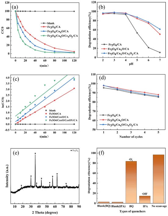 As shown in Figure 10d,e the catalyst demonstrates excellent stability, retaining over 85% of its catalytic degradation capacity after five cycles under optimal pH conditions [57]. Meanwhile, the structure of the crystal did not undergo any significant changes and remained the same as before. The free radical quenching experiment showed that capturing ·OH− reduced the catalytic efficiency by 81.08, suggesting that the catalytic degradation process is mainly related to ·OH− [58].